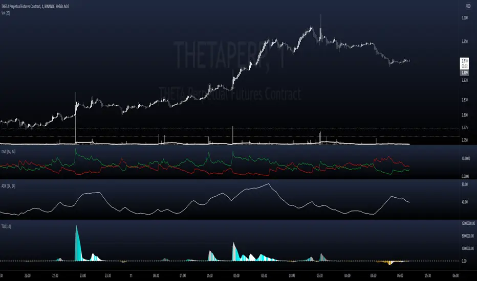 In the above chart you can see the volume indicator, DMI, ADX, with the TSO (Trend Strength Oscillator) on the bottom for context and to show just how much more intuitive the TSO is.