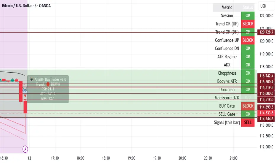 * Session, Trend OK (UP/DN), Confluence (UP/DN), ATR Regime, ADX, Choppiness, Body vs ATR, Donchian, **MomScore U/D**.