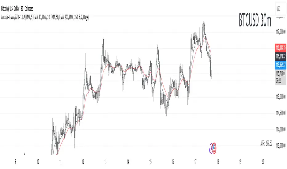The Anrazzi - EMAs/ATR indicator is a versatile tool for technical traders looking to monitor multiple moving averages alongside the Average True Range (ATR) on any chart. Designed for simplicity and customization, it allows traders to visualize up to six moving averages with configurable type, color, and length, while keeping real-time volatility information via ATR directly on the chart.