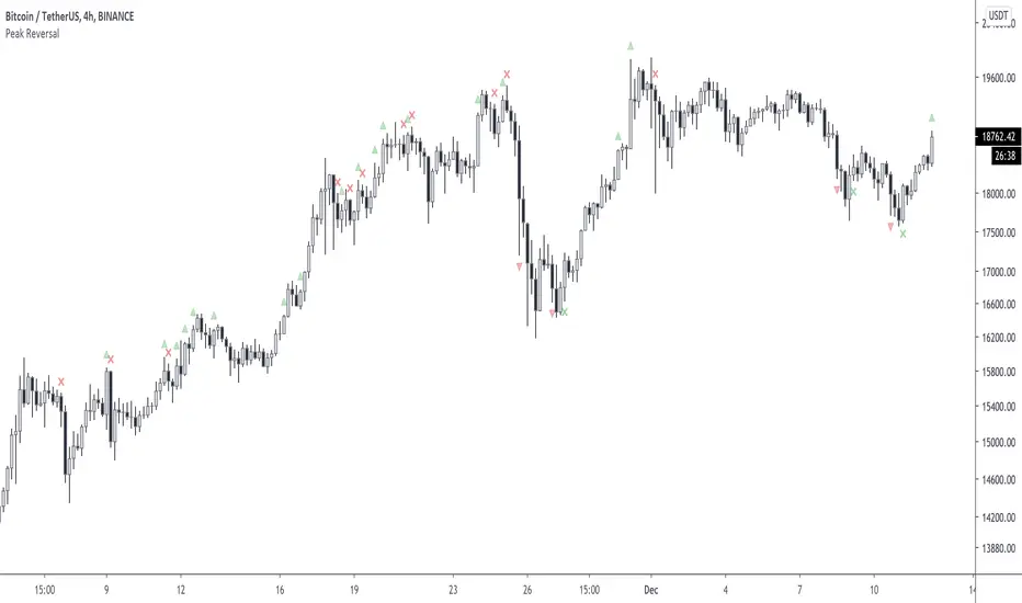 Peak Reversal is an indicator, which can be used as an early identification for a reversal, or a reversion to the mean. In mean reversion we try to find the bar where we can be certain a reversal is in play, as opposed to the proverbial knife catch. Peak Reversal helps by identifying the bar that actually reversed trend. As you can see it is often accurate, but as you can tell, one has to be careful applying this indicator to their trading, as the trend can just continue onwards.