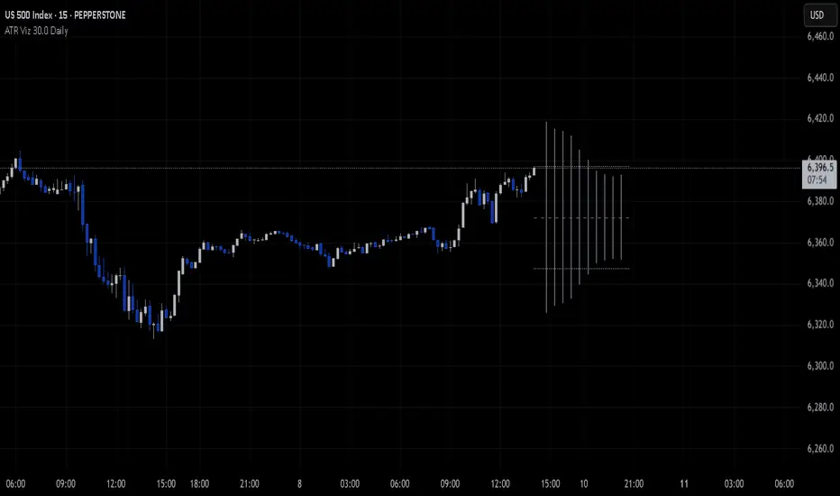 This script visualizes ATR values as candles to the right of the last candle at today's high and low.