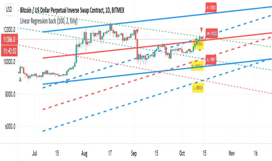 crossing any of the backward linear regression or trend line regression show a signal . cross up is green triangle. cross down is red triangle.
