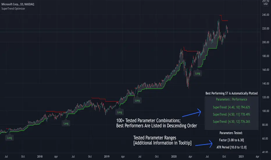 This indicator attempts to optimize Supertrend parameters. To achieve this, 102 parameter combinations are tested concurrently - the top three performers are listed in descending order.