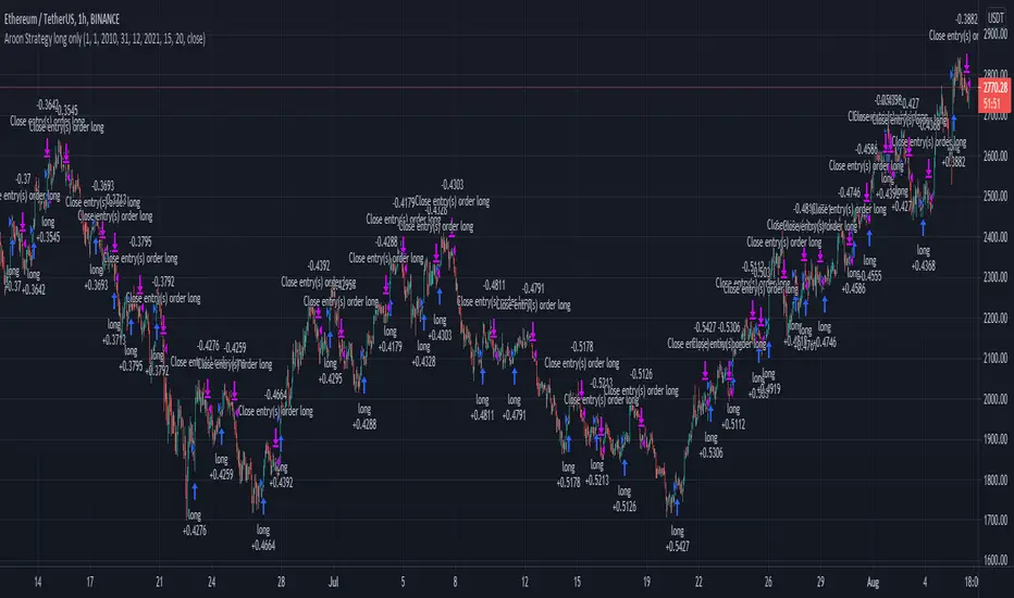 Long entry = crossover of upper part with the lower part from aroon and close of the candle is above the moving average