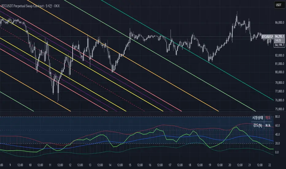 This indicator is ideal for traders who want to analyze market conditions across multiple timeframes without switching charts. It automatically adjusts settings based on the current timeframe and includes a dynamic weighting system optimized for Bitcoin volatility. Additionally, a real-time information panel displays the market state (buy/sell) and signal strength.