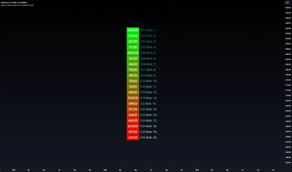 The indicator calculates the salience measure for each cryptocurrency by evaluating how much its return deviates from the average market return over a user-defined ranking period. This measure helps identify which assets are trending predictably and which are likely to experience a reversal.