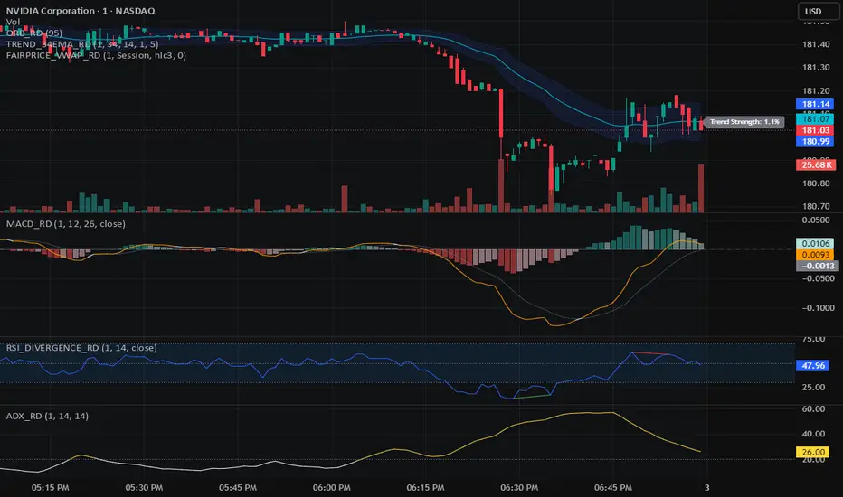- Calculates +DI, –DI, and ADX using standard Wilder smoothing (RMA).