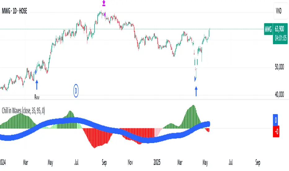 📈 Chill in Waves – Ride Trends with ConfidenceChill in Waves is a versatile and intuitive trend-following indicator that blends price action with statistical normalization to highlight meaningful market shifts. Originally designed with volume-weighted logic, the latest version simplifies the engine by using standard moving averages (MA)—making it more accessible, stable, and better suited for emerging markets like Vietnam’s stock exchange, where volume data may be limited or inconsistent.