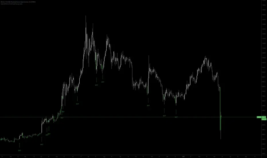 There are many ways you can use these buy opportunities. I recommend buying after waiting for the candle to flip white (from green), this will be accompanied by the text, 'SPOT'. However, aggressive entries can be taken by slowly averaging in while the candle colouring is green.
