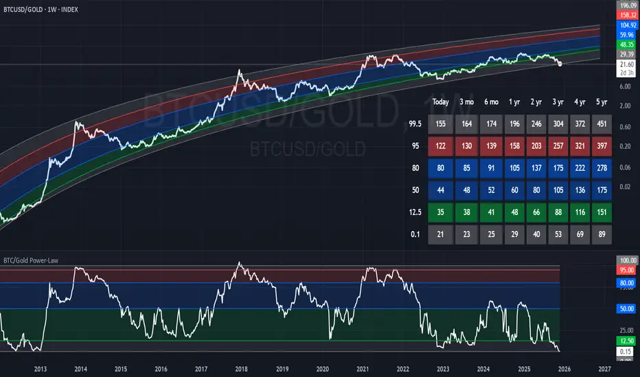 This indicator visualizes a set of statistically derived Power-Law bands for the BTC/Gold ratio.