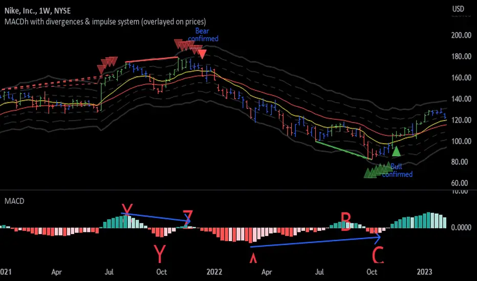 In the example in the chart above (weekly charts of NKE, Nike, Inc.), you see a bearish divergence that signaled the October 2022 bear market bottom, giving a strong buy signal right near the lows. In area A, NKE (weekly charts) appeared in a free fall. The record low A of MACD-H indicated that bears were extremely strong. In area B, MACD-H rallied above its centerline. Notice the brief rally of prices at that moment. In area C, NKE slid to a new bear market low, but MACD-H traced a much more shallow low. Its uptick completed a bullish divergence, giving a strong buy signal.
