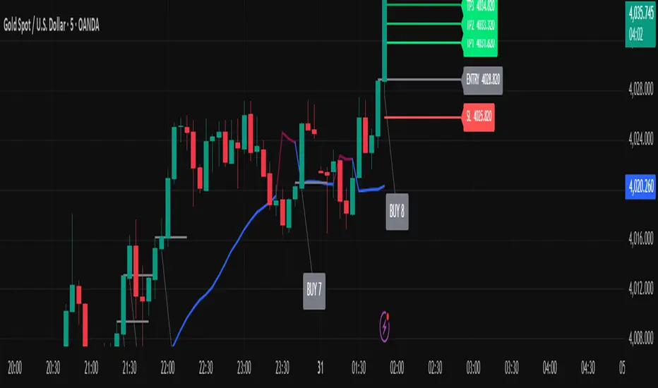 Golden Ladder is a momentum-and-structure tool that detects three-bar ladder waves and filters them with a Gann Hi/Lo regime guide (SMA-based). When a valid wave aligns with the current Hi/Lo bias and passes optional market filters (ADX, RSI, and proximity to recent extremes), the script prints BUY/SELL n labels (n = wave index) and draws a complete Entry / SL / TP1–TP4 ladder using ATR-based risk units (R) or fixed caps—configured for clarity and consistency. The script also keeps the chart clean: the last trade remains fully drawn while historical groups are trimmed to compact “ENTRY-only” stubs.