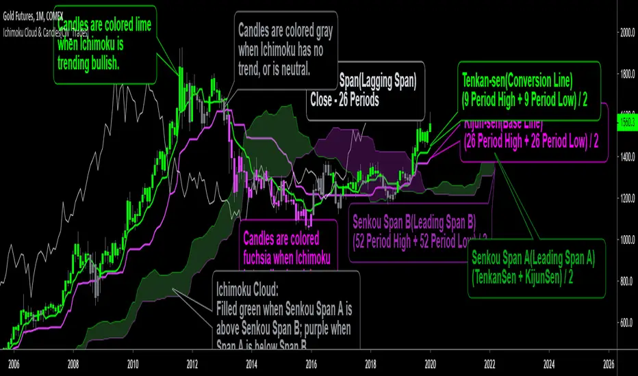 This indicator uses standard/default Ichimoku settings. The difference between this indicator and standard Ichimoku indicators is that the candle colors are based on price relative to the Tenkan-sen and Kijun-sen, and as such are painted lime, fuchsia and gray. Lime price candles indicate that price is in an uptrend; fuchsia candles indicate a downtrend; gray is no identifiable trend, or neutral.