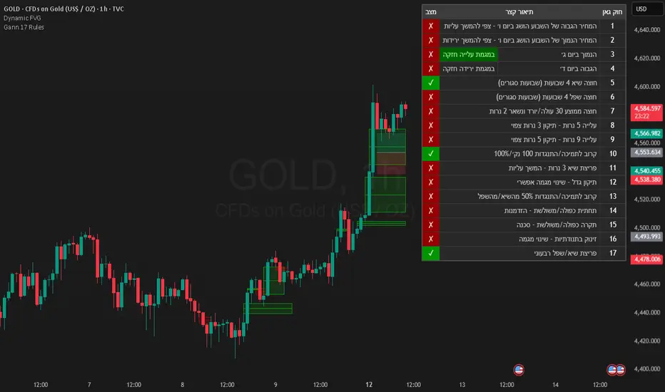 This indicator implements all 17 classic trading rules developed by W.D. Gann, one of the most legendary traders in history. The rules are displayed in a real-time status table with Hebrew descriptions.## Features