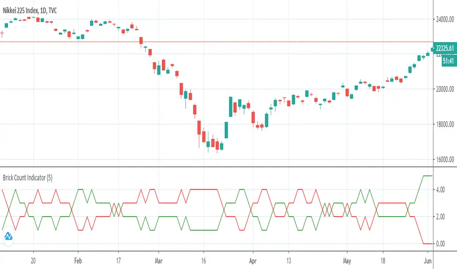 Friends, "Brick Count indicator" works on very easy calculations. We had to develop this indicator on the trading view. This indicator was not available elsewhere. This indicator counts bullish and bearish candles at the default settings of the last 40 periods. Which shows us the trend of the market. If the bullish candle is high then it means in the market uptrend and if the bearish candle is high then it shows that the market is bearish.