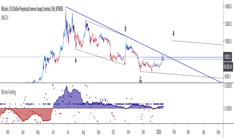 This will show an estimate of the Bitmex Funding Rate and also a moving average of the rate. The moving average will be most accurate on the 8 hour chart as funding is paid every 8 hours. Values are NOT official, but can be helpful for sentiment. The Moving Average helps reflect that one or two funding changes do NOT result in a reversal. In a bull trend, funding often does not fully favor shorts until near the middle of the trend.