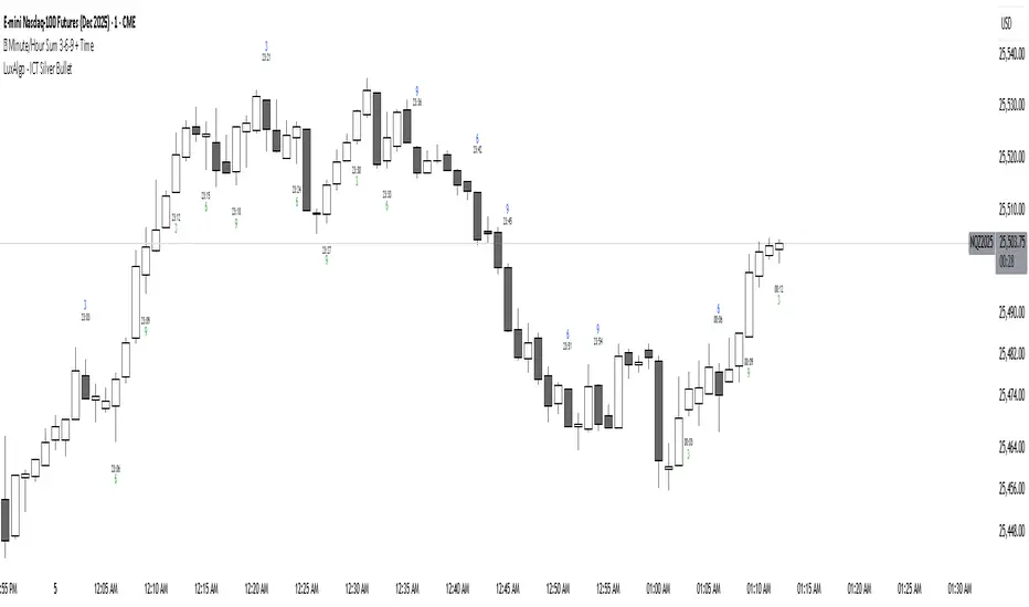 On intraday charts below 1 hour it sums the digits of the minute, such as 21 which becomes 2+1=3. On hourly or higher charts, it sums the digits of the hour, like 12 which becomes 1+2=3. The indicator plots a label “3,” “6,” or “9” above or below the candle depending on whether it is bearish or bullish. Sum numbers change with direction to visually signal sentiment. You can adjust the timezone offset to align with your local RTH or ICT timing.