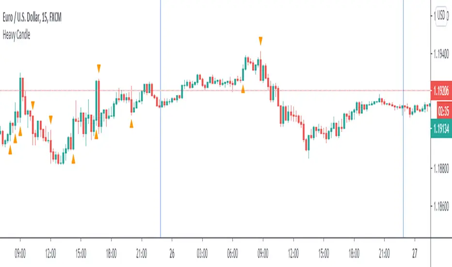Heavy Candle compares current candle size to its previous, the one before that and different Average True Ranges. The point is to objectively highlight a sizeable candle to enter the market with. The direction is based on if the close is above VWAP or below it.