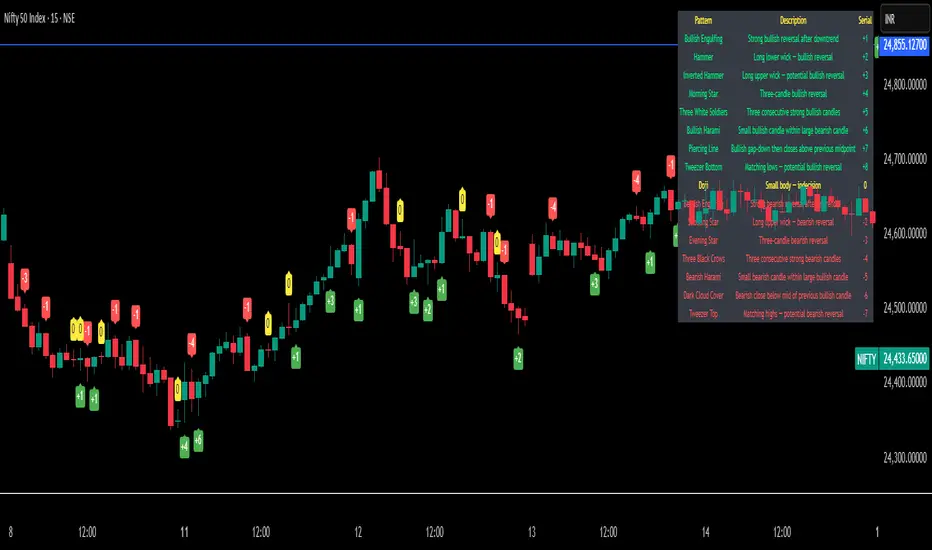 This indicator automatically detects and highlights common candlestick patterns on the chart and provides a reference table with explanations. It is designed as a visual and educational tool for learning candlestick psychology and price action.