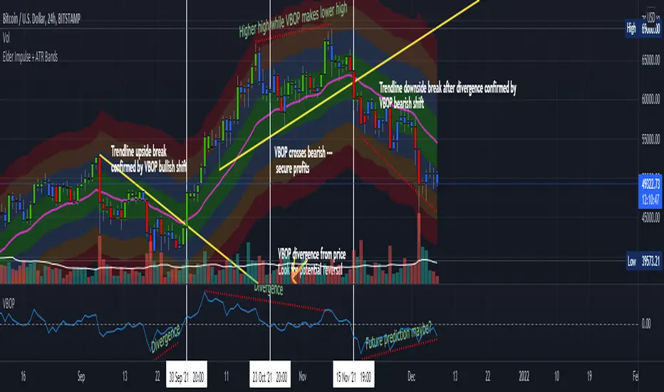 I have modified the Balance of Power indicator that measures the difference between the open and the close and the high and low of the current bar to incorporate volume information as well. Further, I have smoothed the indicator, which is usually very choppy and difficult to read with a 21 period Least Squares Moving Average to create a Volume-Weighted Balance of Power. Since we are all aware that volume precedes price I figured this could be a neat little trend-confirmation indicator.