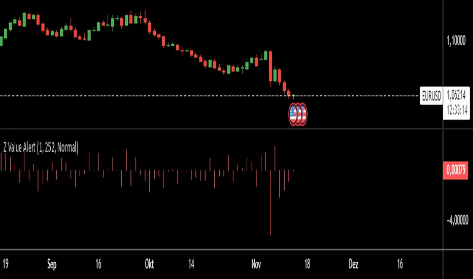 Z Value Alert analyzes daily price movements by evaluating fluctuations relative to historical volatility. It calculates the daily percentage change in the closing price, the average of this change over 252 days, and the standard deviation. Using these values, a Z-Score is calculated, indicating how much the current price change deviates from the historical range of fluctuations.