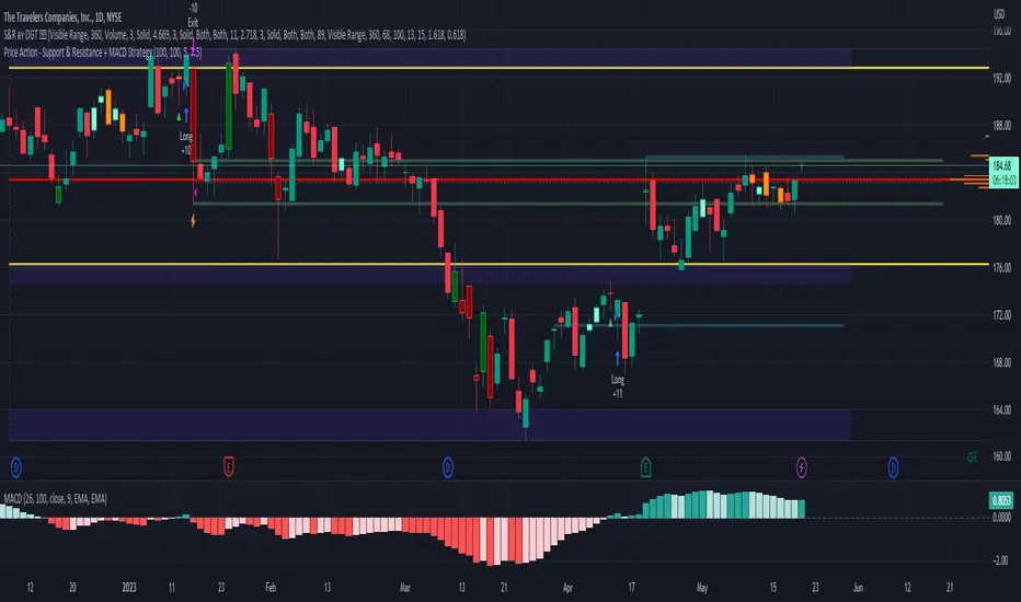 Bullish Trade: Look for a bullish setup when the price approaches a strong support level identified by the "Price Action - Support & Resistance by DGT" indicator. Wait for the MACD lines to cross above the signal line and the histogram to turn positive, indicating bullish momentum. Enter a long position with a stop loss below the