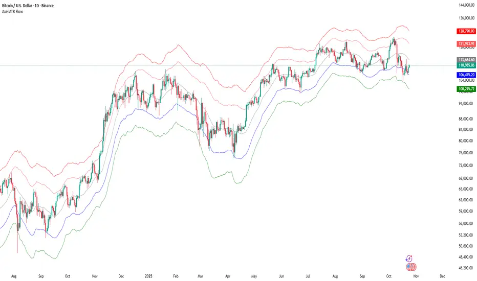 Axel ATR Flow is a dynamic, volatility-adaptive channel designed to visualize the natural rhythm of market movement.