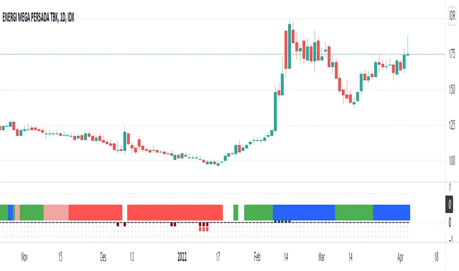 2. A vertical trend bar represents long term trend. Bars that above the axis is an uptrend bar. If it occurs, the long term bullish trend is exists. Bars below the axis is a downtrend bar. If it occurs, the long term bearish trend is exists. If there is no bars (empty), means the long term trend is weakened but the trend still as same as the last bars occurrence.