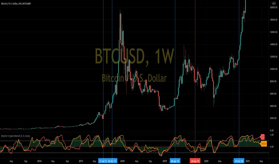 As you may be able to see, when Bitcoin (gold colour) crosses over the Others (red colour) in the indicator, it signifies a swing in popularity towards Bitcoin, and it appears to have predicted some of the recent large rallies (blue Vertical lines) and pull-backs (red vertical lines)
