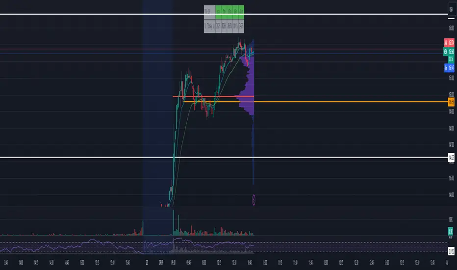 The indicator calculates the Pre-market volume percentage of the current day, relative to the average volume being traded in the trading session (14 days), displayed in Table Row 1, Table Cell 1, as V%. Pre-market volume between 15% & 30% has a orange background color. Pre-market volume percentage above 30% has a green background color.The indicator calculates the relative volume per candle relative to the average volume being traded in that time period (14 days) (e.g., "1M," "2M," up to "5M"), displayed in a table. Relative volume between 250% & 350% has a orange background color. Relative volume above 350% has a green background color.