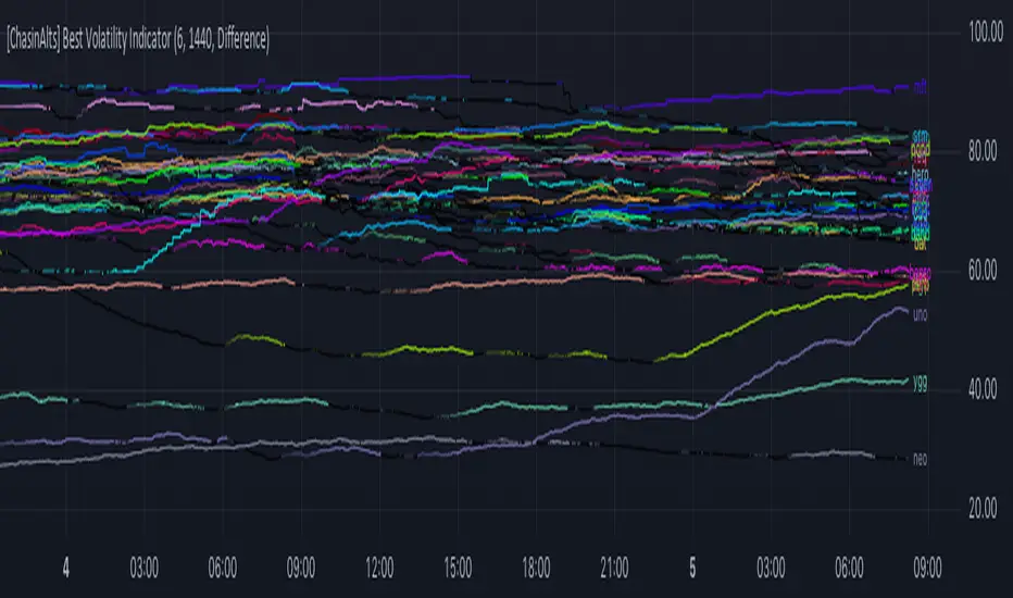 Wether on the 1sec TF or the 1day (or ANY other), the only time TV prints a bar/candle is when a trade occurs for that asset (i.e. a change in volume). Even if Open=Close on the same candle, the candle will print with the updated price. The % of candles printed out of the TOTAL possible amount that COULD HAVE been printed is the ultimate output that’s calculated in the script. So, if the lookback setting=10min on the 1min TF and only 7 out of the last 10 candles have printed then the value will appear as 70(%). There are MANY benefits to using this method to measure volatility but its vital to recall that the indicator does nothing to provide the direction of future price movement. One thing I’ve noticed is that when a coin is just beginning it’s ascent and its move is considerably larger/longer than all the other coins OR the plots angle is very steep, it is usually the end of a move and the direction is about to abruptly reverse, continuing with it’s volatility. As volatility increases more and more the plot gets brighter and brighter…and also vise versa.