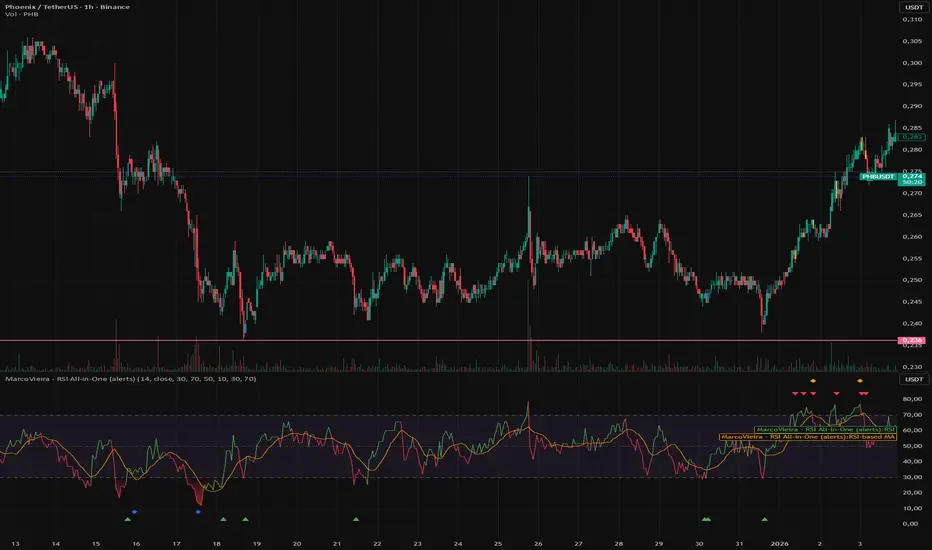 Indicator MarcoVieira - RSI All-in-One (alerts) is a customized version of the classic RSI (Relative Strength Index). It includes several advanced features such as entry signals, divergences, moving averages for smoothing, dynamic coloring, and candle painting.