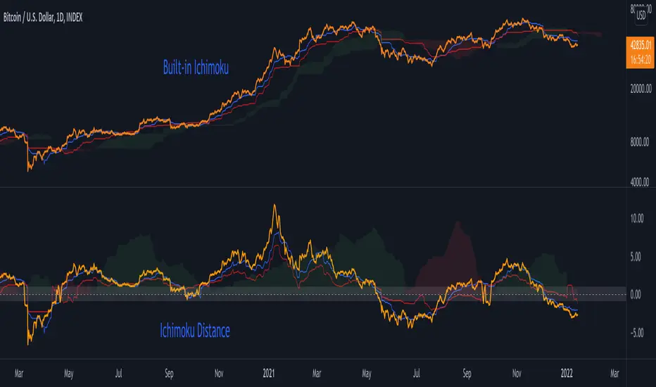 - Distance to Center: the various lines of the Ichimoku system are displayed as the distance to the center of the cloud in percentage terms. 0 is the center of the cloud.