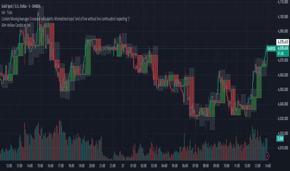 This indicator overlays 30-minute candles on a 5-minute chart using clean, hollow-style higher-timeframe (HTF) candles.