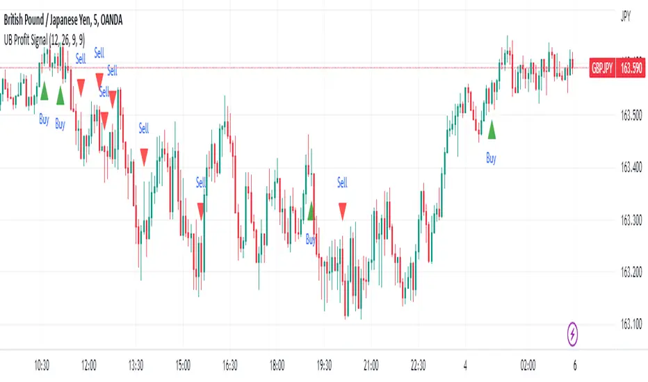 The buy and sell signals are plotted on the chart using the plotshape function, which creates triangular shapes above and below the bars to indicate the signals. Green triangles indicate a buy signal, while red triangles indicate a sell signal. Overall, the UB Profit Signal indicator can be useful for traders looking to identify potential buy and sell signals in the market and take advantage of price movements.