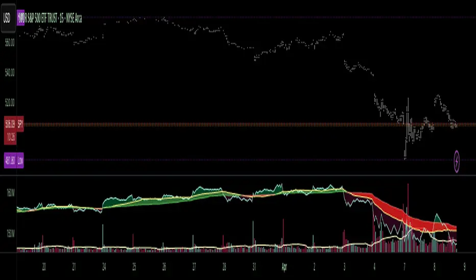 🚦 The core signal compares OBV to its fast moving average. When OBV climbs above the short average, it fills green—suggesting real directional effort. When OBV sinks below, the fill turns maroon—flagging fading conviction or pullback potential. A second fill between the short and long OBV moving averages captures the broader trend of volume intention. If the short is above the long, this space fills greenish, showing constructive pressure. If it flips, the fill fades red, signaling crowd hesitation, rotation, or early exhaustion.