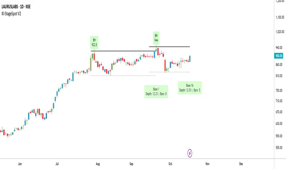 KI-StageSpot V2 is a stage analysis and base-tracking tool that overlays key moving averages, highlights crossovers, and marks base highs, lows, and breakouts — now visible on both weekly and daily charts. It also displays each base’s depth and duration stats with customizable labels, alerts, and styling options.