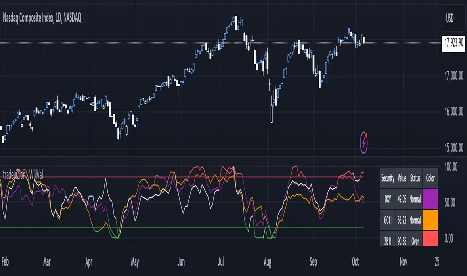 Welcome to the Larry Williams Valuation Index by tradeviZion! This script is an interpretation of Larry Williams' famous WillVal (Valuation) Index, originally developed in 1990 to help traders determine whether a market or asset is overvalued or undervalued. We've extended it to support multiple securities and offer alerts for different valuation levels, helping you make more informed trading decisions.