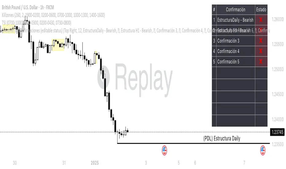 This indicator creates an on-chart checklist table designed to help traders visually track up to 10 trade confirmations or conditions.Each row represents a custom confirmation that you can name, toggle on/off for visibility, and mark as fulfilled or not. The table dynamically updates and displays colored status indicators (✅ for confirmed, ❌ for unconfirmed) with customizable labels and layout position.