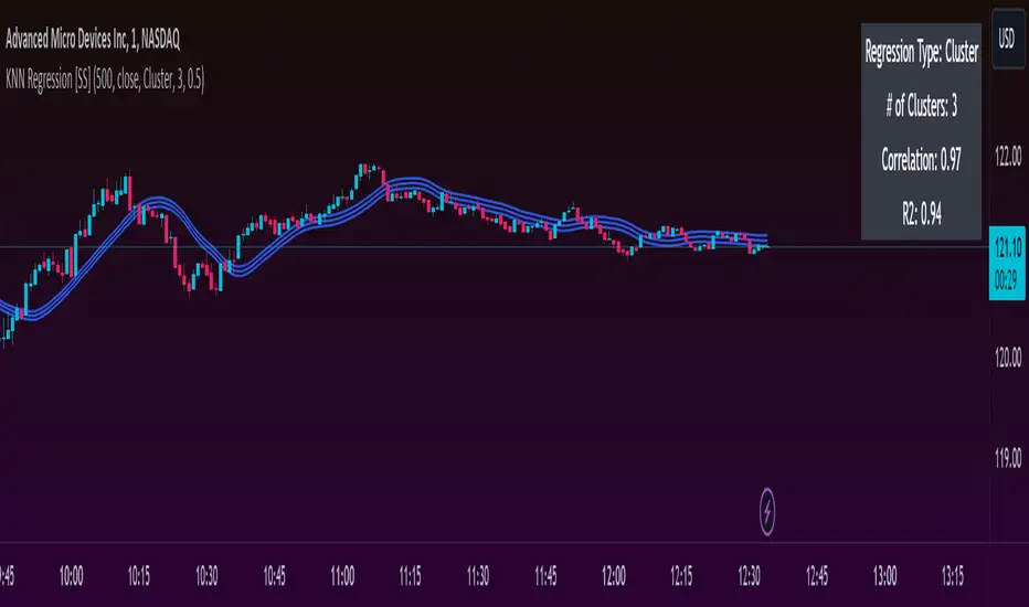I have permitted 3 types of KNN regression. Traditional KNN regression, as I understand it, revolves around clustering. (Clustering refers to identifying a cluster, normally 3, of identical cases and averaging out the Dependent variable in each of those cases). Clustering is great, but when you are working with a finite dataset, identifying exact matches for 2 or 3 clusters can be challenging when you are only looking back at 500 candles or 1000 candles, etc.