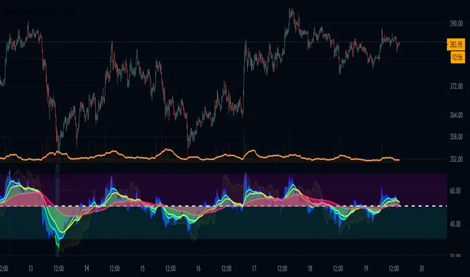 Using RSI and 4 exponential moving averages, I created this indicator so that you can spot inconsistencies between price action and RSI. There's a lot of misunderstanding surrounding RSI, most people think if something's 'oversold' buying is a guarantee win. This definitely isn't the case as there's many more variable to consider. In addition, with this indicator, candles are colored based off of volume.
