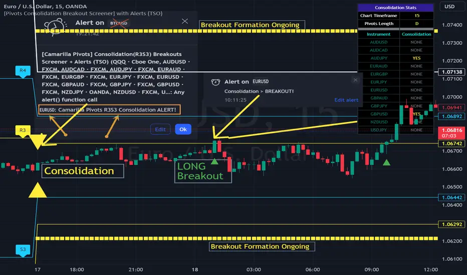 * Once alert triggers, don't get confused, as it will show "Alert on SYMBOL", the SYMBOL will be where you created the major alert for all the symbols within the screener list! Within the alert, on the bottom, it will say: "EURUSD: Camarilla Pivots R3S3 Consolidation ALERT!" - this is where the correct symbol is for which the alert for consolidation was triggered!