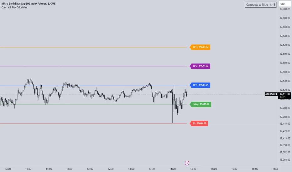 The script plots the entry and stop loss lines on the chart for visual reference. Additionally, it displays a label in the top-right corner of the chart, showing the calculated number of contracts to risk. The label updates dynamically as the input values or market conditions change.