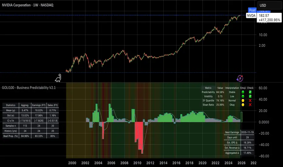 This indicator was built to explore exactly that dynamic. It helps you quantify how predictable a business truly is, how consistently it beats (or misses) expectations, and how well management seems to understand and guide its own performance. It’s not a timing tool, but a quality lens for long-term stock pickers who want to identify stable, well-managed companies with disciplined forecasting and execution.