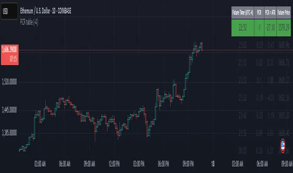 This indicator displays a multi-period table of forward-looking price projections. It combines normalized directional momentum (Positive Change Ratio, PCR) with volatility (ATR) and presents a forecast for upcoming time intervals, adjusted for your local UTC offset.