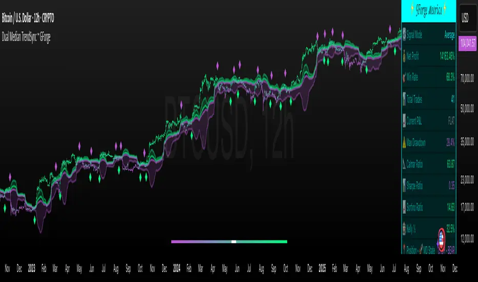 Median TrendSync is a sophisticated technical indicator that leverages the statistical power of dual median calculations combined with dynamic momentum deviation analysis. Unlike traditional moving average systems that can be skewed by outliers, this system uses robust median-based calculations to identify genuine trend changes while filtering out market noise. The result is a highly adaptive system that works across all timeframes and asset classes, with exceptional performance in volatile 24/7 markets.