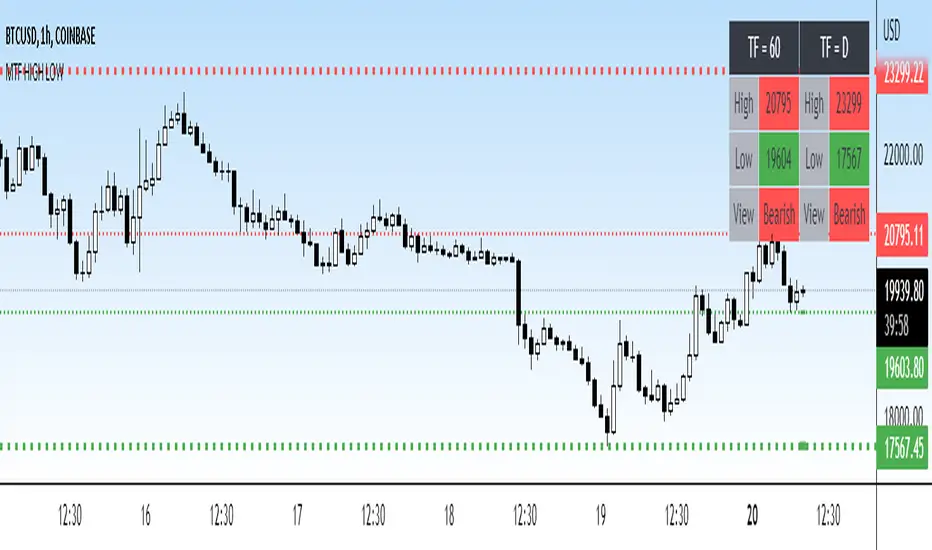 This is a Multi-Time Frame High Low Indicator that plots the highest and lowest price levels of the chart timeframe and a user selected higher timeframe.