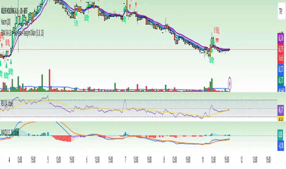 This indicator helps you identify market trends and potential reversal points in a single tool. It uses three Exponential Moving Averages (EMA 5, EMA 8, and EMA 13) to determine trend direction and highlight important crossover signals.