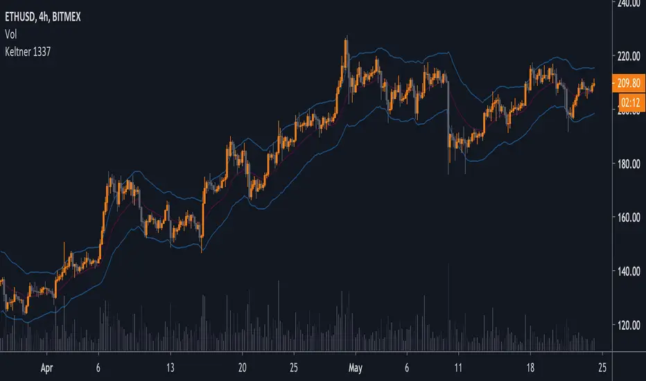 This is a configurable Keltner Channel type indicator with an overridable ATR length.