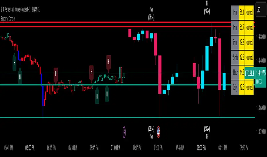 The Emperor RSI Candle includes an RSI box displaying multi-timeframe RSI values from 1 min to monthly. This provides: